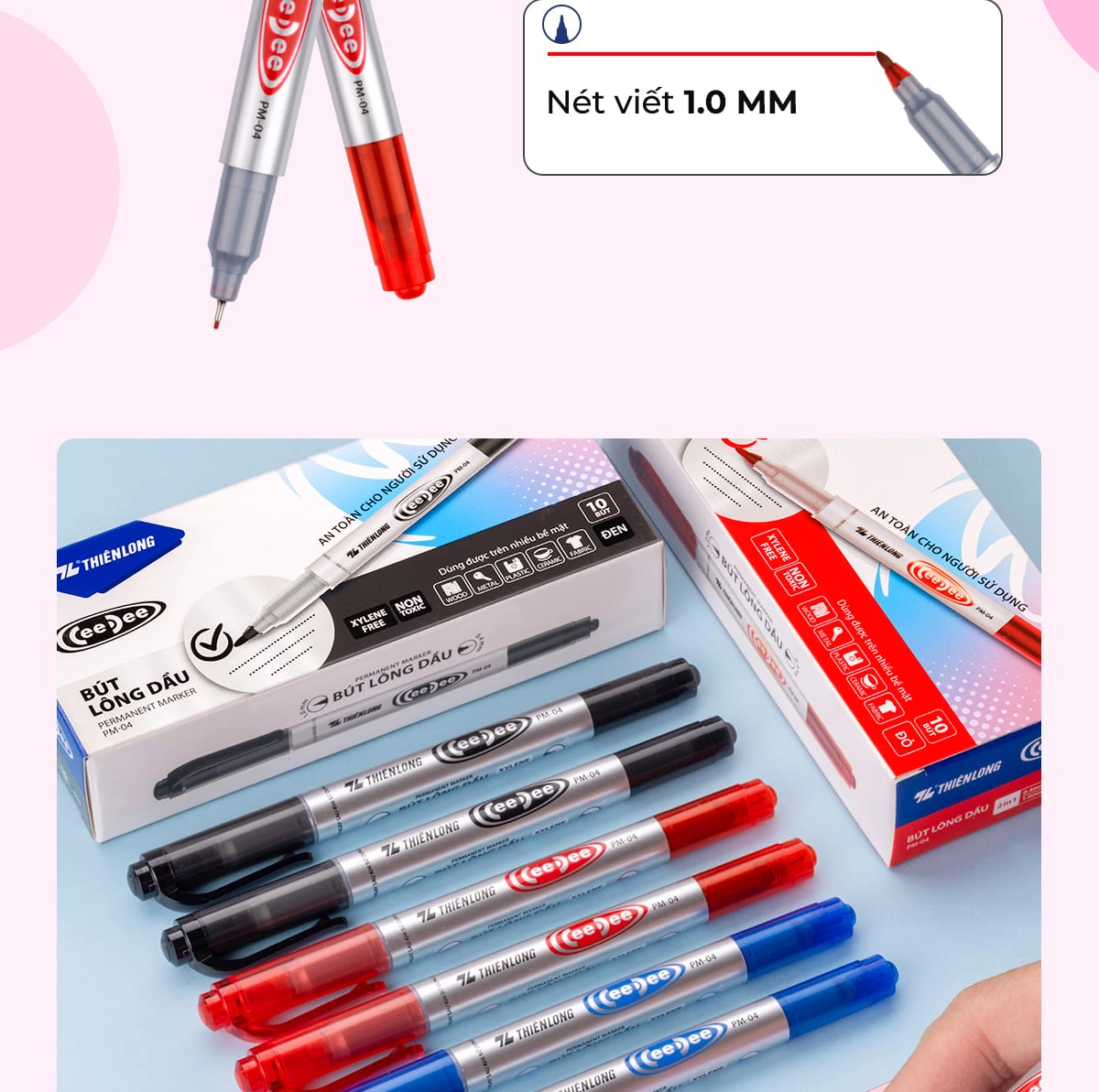 Bút lông dầu Thiên Long PM-04 là dòng bút đánh dấu đa năng được sử dụng phổ biến tại Việt Nam. Với thiết kế 2 đầu tiện lợi cùng chất lượng mực ổn định, sản phẩm phù hợp cho nhiều nhu cầu từ học tập đến công việc văn phòng và đánh dấu trên nhiều bề mặt khác nhau.