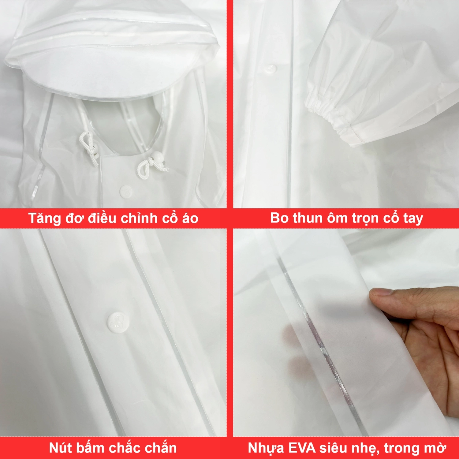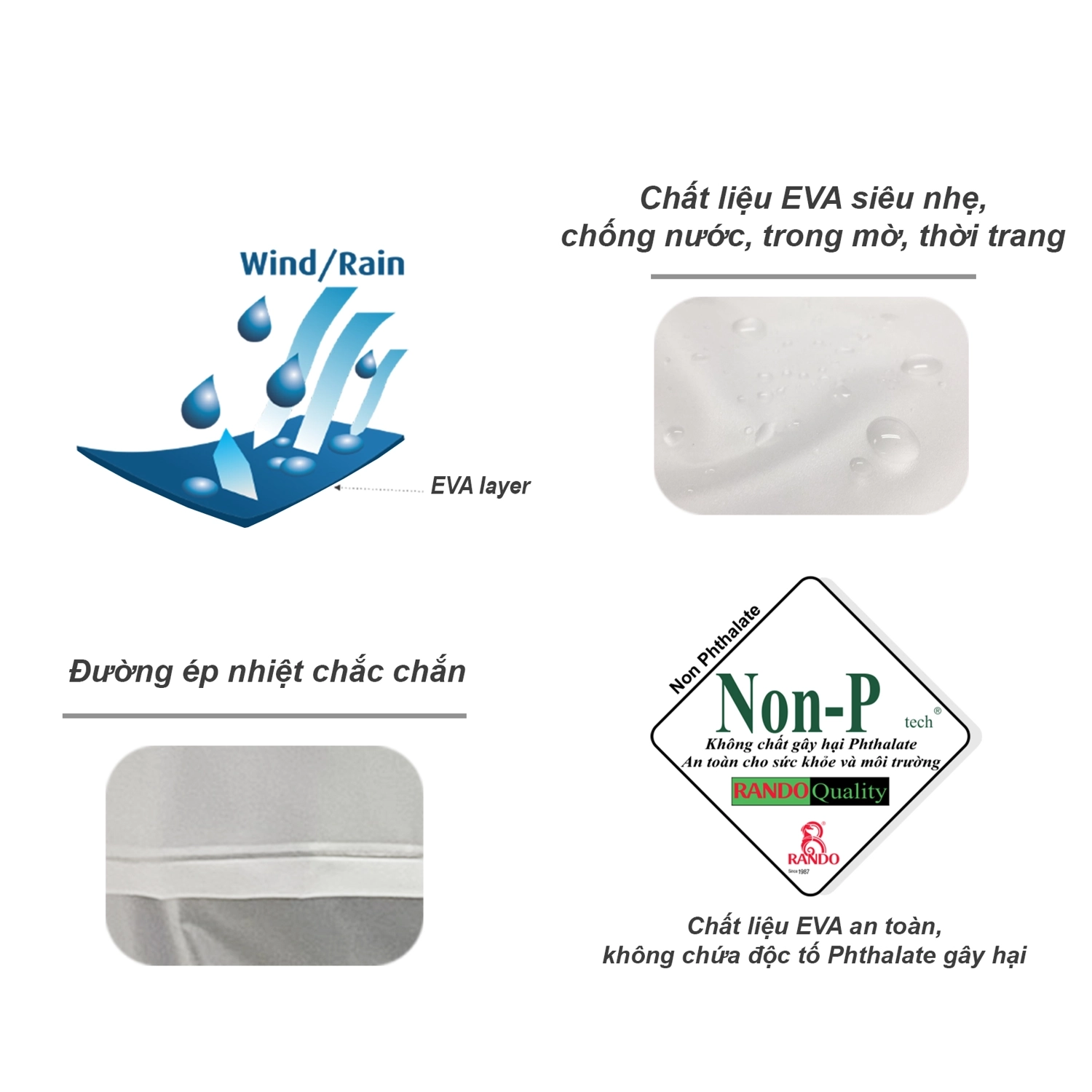 - Chất liệu sản xuất từ màng nhựa EVA (Ethylene Vinyl Acetate Copolymer) sản phẩm không chỉ đáp ứng nhu cầu thiết yếu là che mưa mà còn mang tính thẩm mỹ với đặc tính ưu việt như nhẹ, trong mờ thời trang, có độ dẻo dai và mềm mại, không độc hại cho người sử dụng.