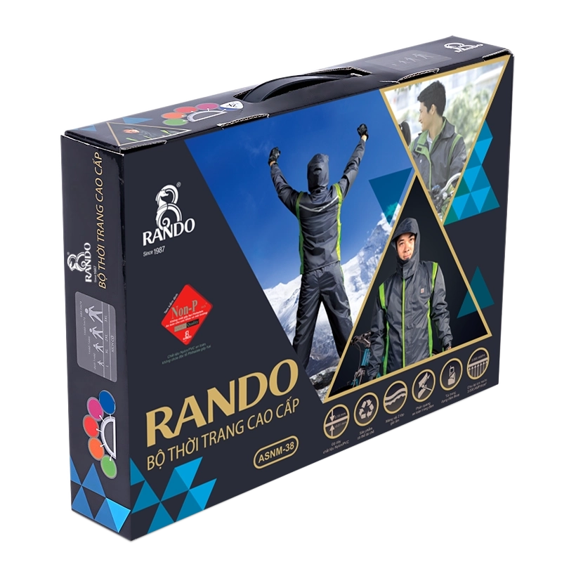 - Lần đầu tiên và duy nhất trên thị trường, Rando đã thiết kế quần áo hai công dụng vừa đi mưa vừa giữ ấm thân thiện dành cho nam, mang lại cảm giác nhẹ nhàng, cá tính và thời trang khi cơn mưa bất chợt ập đến. Bộ Thời trang cao cấp nam đã tạo ra sự đột phá độc đáo về ý tưởng thiết kế dựa trên nền tảng áo gió đi mưa, với mẫu quần áo được thiết kế trẻ trung, ôm vừa người mặc. Túi chứa điện thoại di động bên trong áo, sọc phản quang kết hợp màu phối hiện đại giúp tăng tính an toàn khi di chuyển, lưu thông bằng phương tiện xe gắn máy.