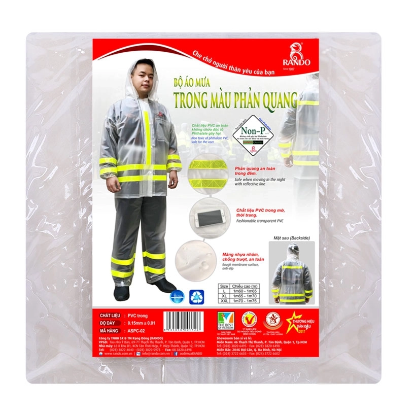 Đặc tính chất liệu PVC trong mờ, nhẹ nhàng với độ dầy 0.15mm vừa đảm bảo tính năng chống nước, vừa an toàn tối đa cho người mặc.