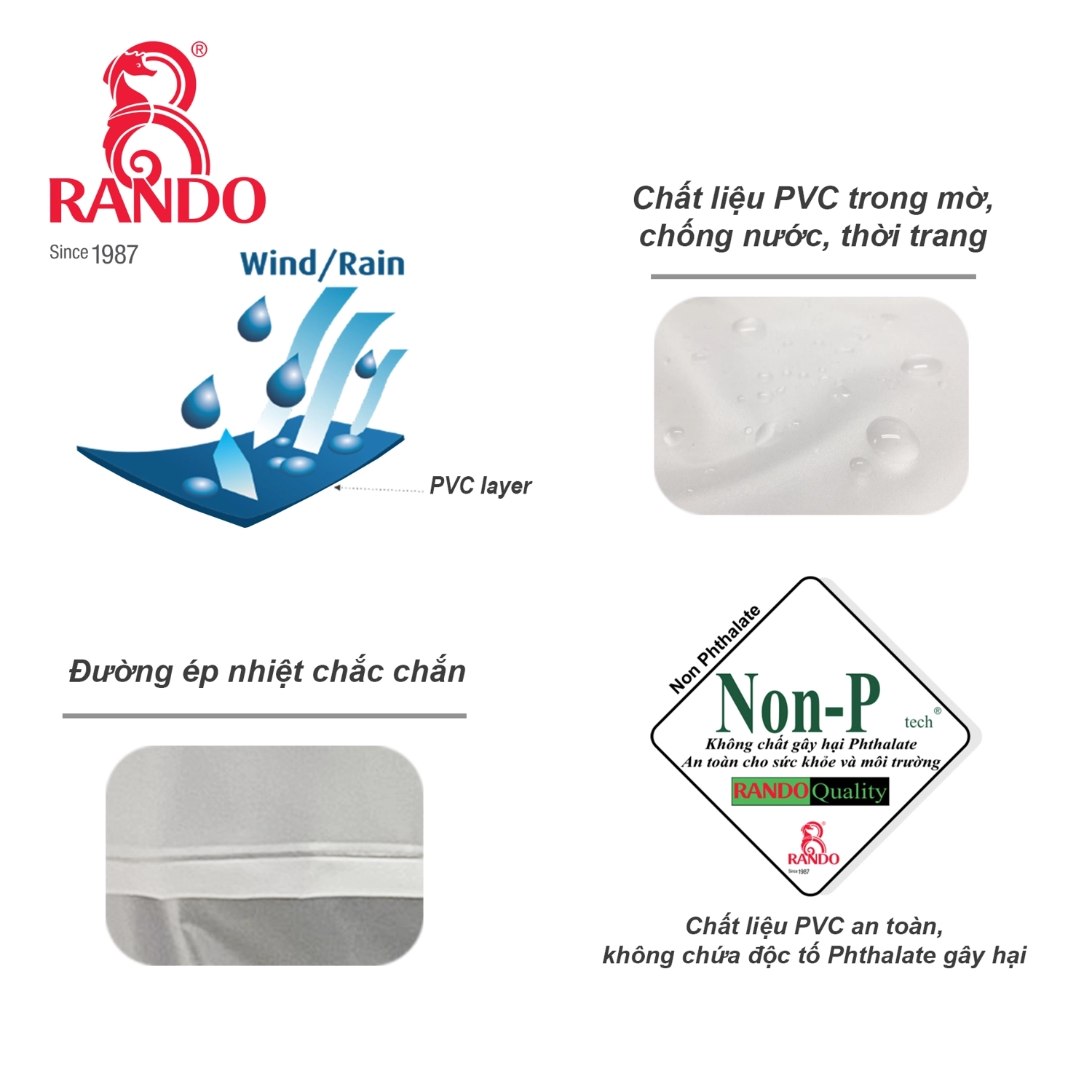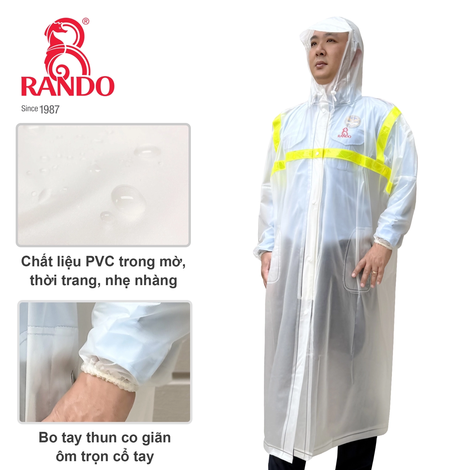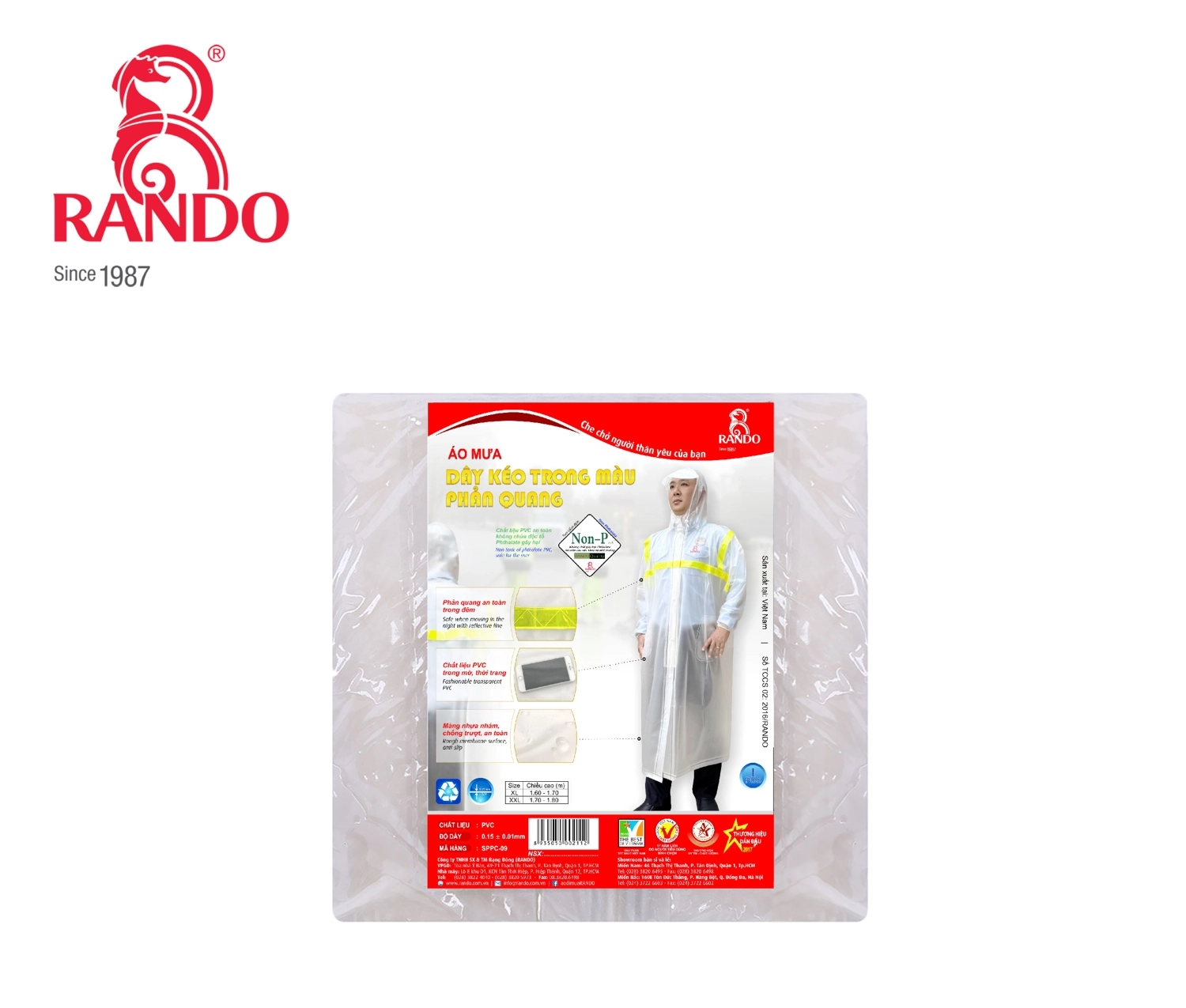 Thiết kế dây kéo tiện lợi, chất liệu PVC chính phẩm không chứa độc tố Phthalate gây hại, sản phẩm mang đến sự an toàn và thoải mái tối đa cho người dùng. Đặc biệt, dải phản quang giúp phản chiếu ánh ánh, tăng khả năng nhận diện vào ban đêm, đảm bảo an toàn khi di chuyển. Sản xuất tại Việt Nam với hơn 38 năm kinh nghiệm, áo mưa RANDO đạt nhiều giải thưởng danh giá như Hàng Việt Nam Chất Lượng Cao và The Best of Việt Nam. Những thành tích trên cũng chính là lý do đã tạo nên sự tin tưởng của khách hàng khi tìm đến áo mưa RANDO