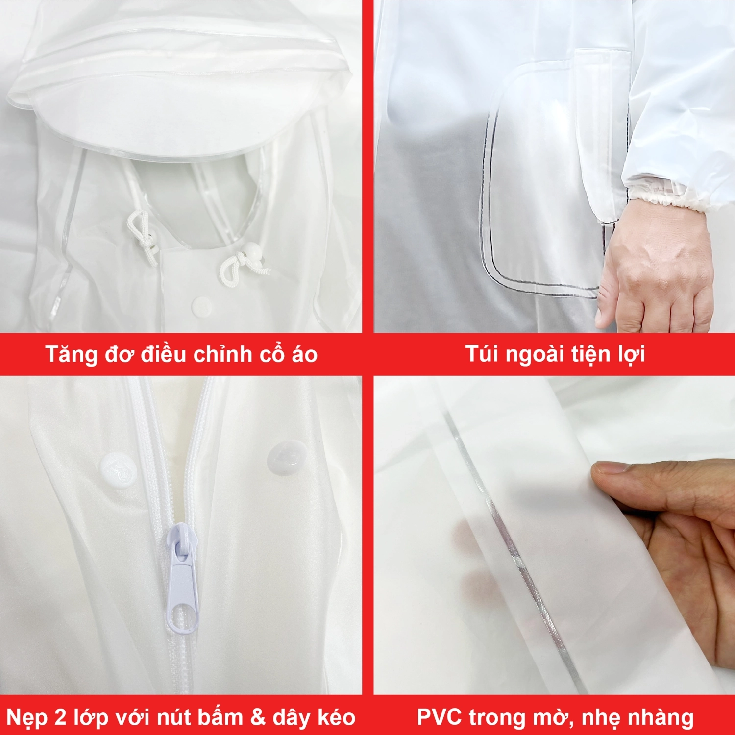 Sử dụng nhựa PVC chính phẩm, trong mờ tạo nên phong cách cá tính, đồng thời không che khuất trang phục bên trong. Chất liệu này cũng đảm bảo chống thấm nước hiệu quả, giữ cơ thể luôn khô ráo.
