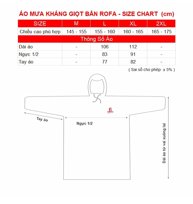 - Áo mưa Kháng Giọt Bắn ROFA là dòng sản phẩm áo đi mưa một người, sản phẩm không chỉ đáp ứng nhu cầu thiết yếu là che mưa an toàn mà còn mang tính thẩm mỹ cho người mặc. Tái sử dụng nhiều lần, kích thước đóng gói nhỏ gọn nhằm tiết kiệm không gian, dễ dàng đem theo khi đi ngoài trời, du lịch, dã ngoại,… để dùng trong các trường hợp mưa bất chợt.