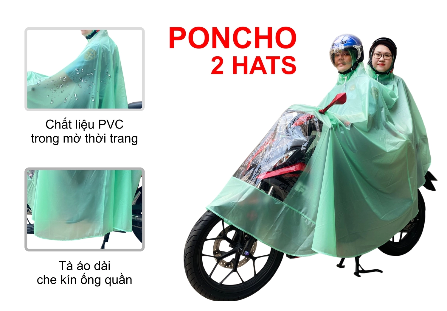 Áo mưa Poncho 2 Hat trong màu có kiếng được trang bị 2 nón nhằm thuận tiện hơn cho người ngồi sau xe, giúp người ngồi sau được thoải mái, thông thoáng mà không ngộp kín khi đi trong mưa so với áo mưa thông thường.