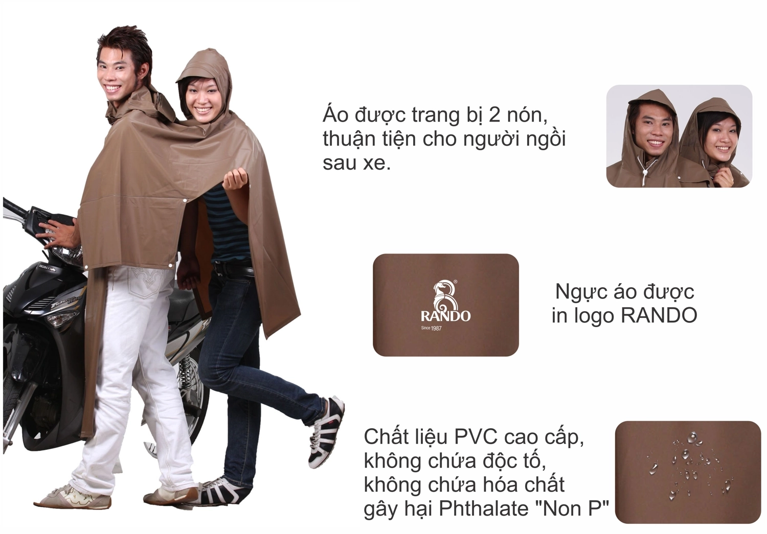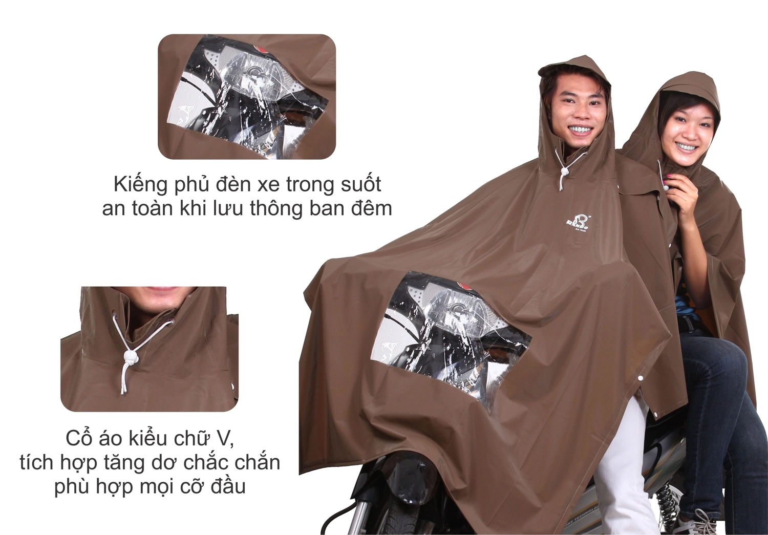 Với thiết kết 2 nón (2 đầu) trong cùng 1 áo đi mưa giúp người ngồi xe sau thuận tiện trong việc quan sát và thông thoáng hơn loại áo mưa truyền thống. Khoảng cách an toàn giữa người ngồi trước và sau sẽ không gây cảm giác vướng víu cho người sử dụng.