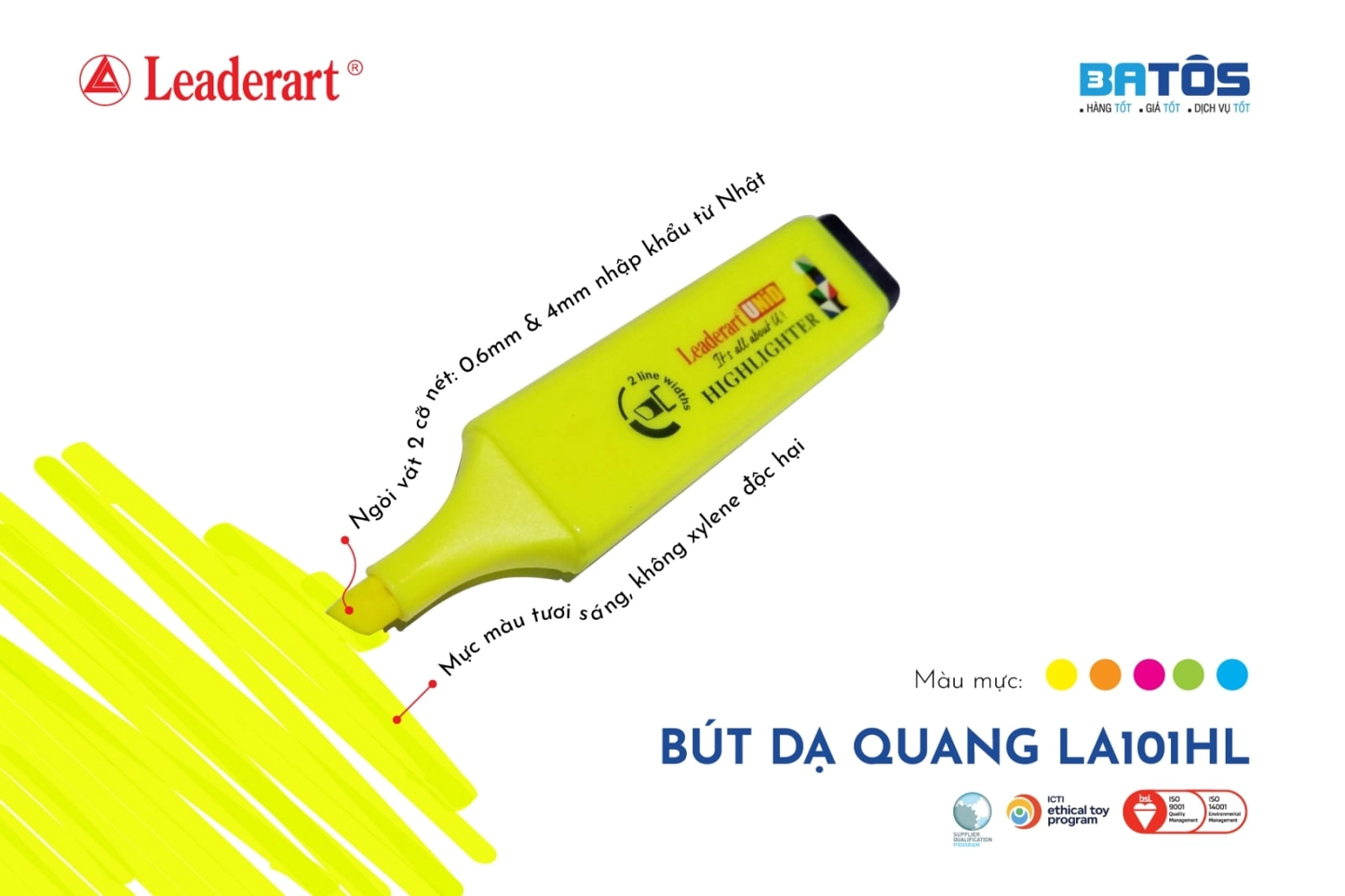 Bút dạ quang LeaderArt UNID LA101HL là dòng bút dạ quang cao cấp với thiết kế thân vuông hiện đại, giúp cầm chắc tay và dễ kiểm soát nét viết. Bút sử dụng mực chất lượng cao, màu sắc tươi sáng, rõ nét, nổi bật trên nền giấy trắng hoặc giấy in mà không làm lem chữ.