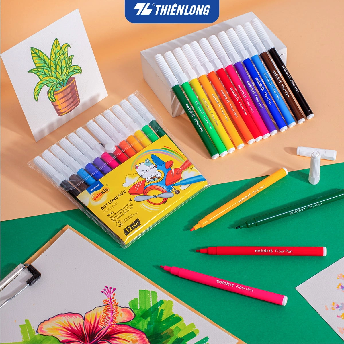 Bút lông màu Thiên Long FP-01 – bộ 12 màu tươi sáng, mực ra đều đẹp, giúp bé tô vẽ dễ dàng và sáng tạo sinh động mỗi ngày.