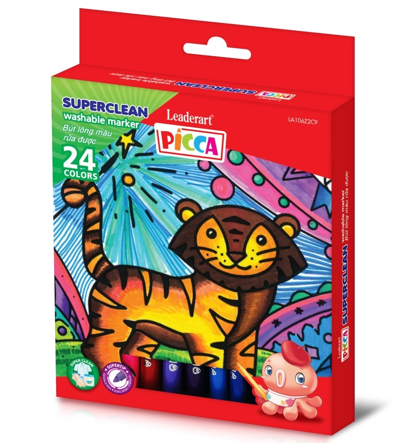 Bút lông màu rửa được Superclean Leaderart LA106Z2C9 được sản xuất với công nghệ mực rửa trôi vượt trội, giúp bé yêu thỏa sức sáng tạo mà không lo mực bám bẩn lên da, quần áo hay bàn ghế. Mực có thể dễ dàng rửa sạch bằng nước, không cần dùng xà phòng, mang lại sự an tâm cho phụ huynh trong quá trình bé học tập và vui chơi.