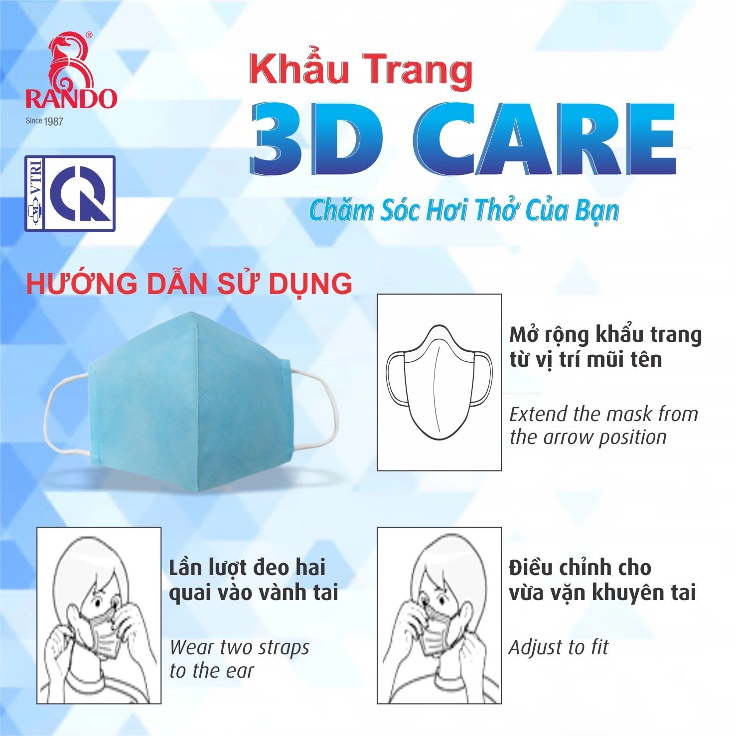 Sản phẩm “KHẨU TRANG 3D CARE” do CÔNG TY TNHH SX –TM RẠNG ĐÔNG (RANDO) sản xuất từ vải không dệt, chuyên dùng để bịt vùng mặt (thường là mũi, miệng) giúp che nắng, gió và ngăn ngừa bảo vệ người đeo khỏi bị lây nhiễm các loại vi khuẩn, dịch bệnh, khói bụi, chất bẩn khi di chuyển thông qua đường hô hấp.