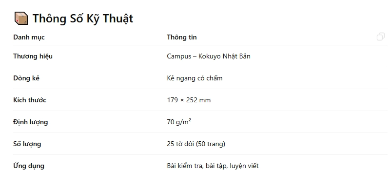 Chất giấy Campus dày 70 g/m², mịn, bám mực tốt, hạn chế thấm và lem nhoè khi sử dụng các loại bút như bút bi, bút gel hay bút máy. Kích thước chuẩn 179 × 252 mm, vừa vặn cho các bài kiểm tra trên lớp, mang lại sự thuận tiện cho cả học sinh và giáo viên.