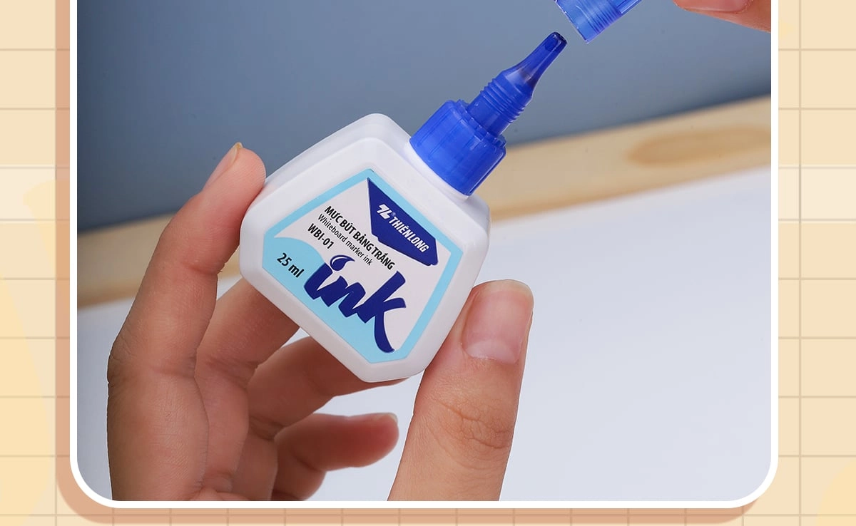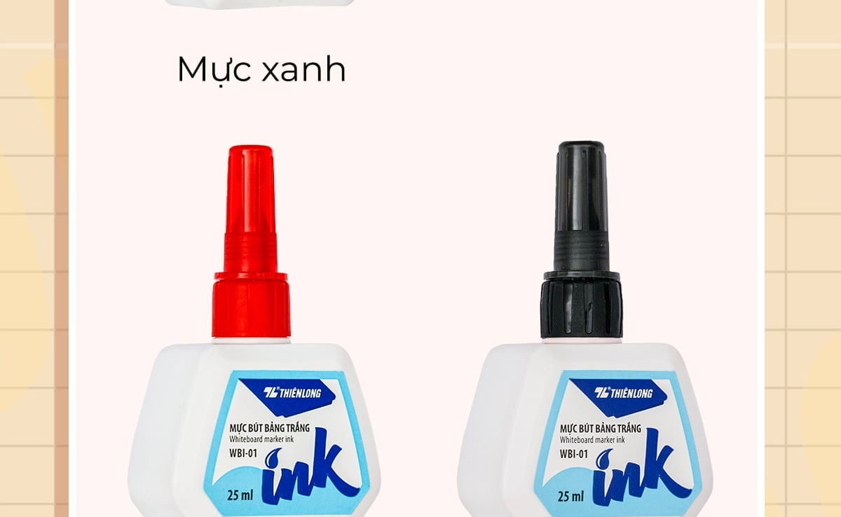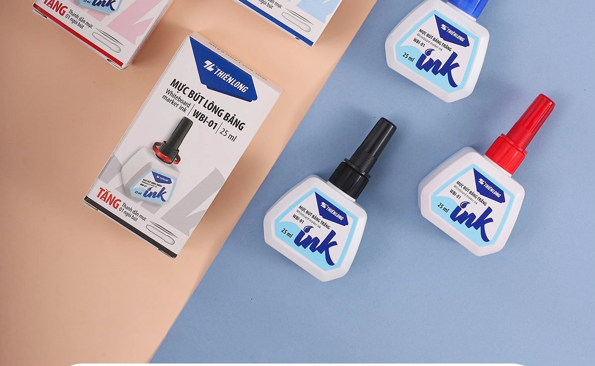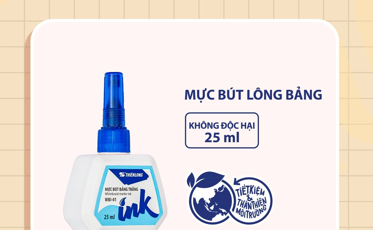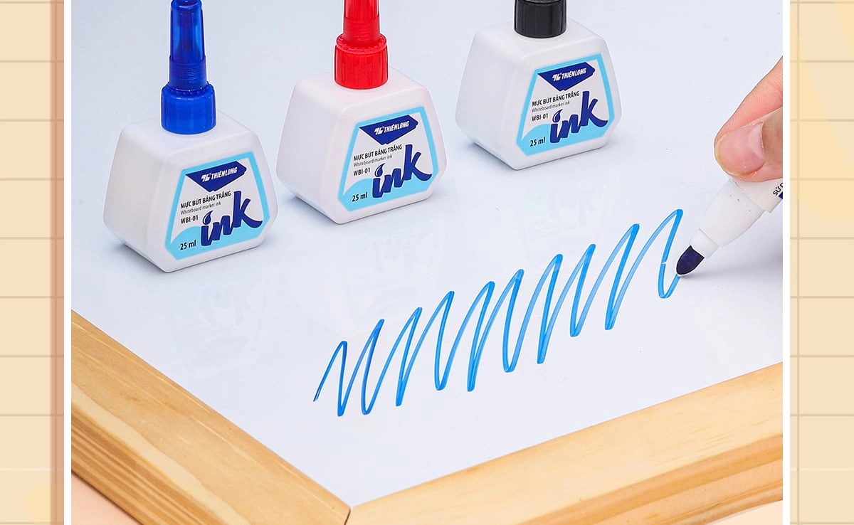 Bình mực bút lông bảng WBI-01 là sản phẩm thuộc dòng văn phòng phẩm. Sản phẩm mang nhãn hiệu Thiên Long được sản xuất bởi Tập đoàn Thiên Long. Dùng để bơm mực cho các loại bút lông lông bảng, để sử dụng tiết kiệm hơn.
