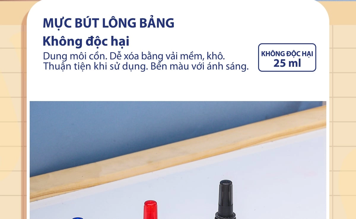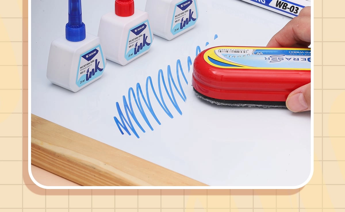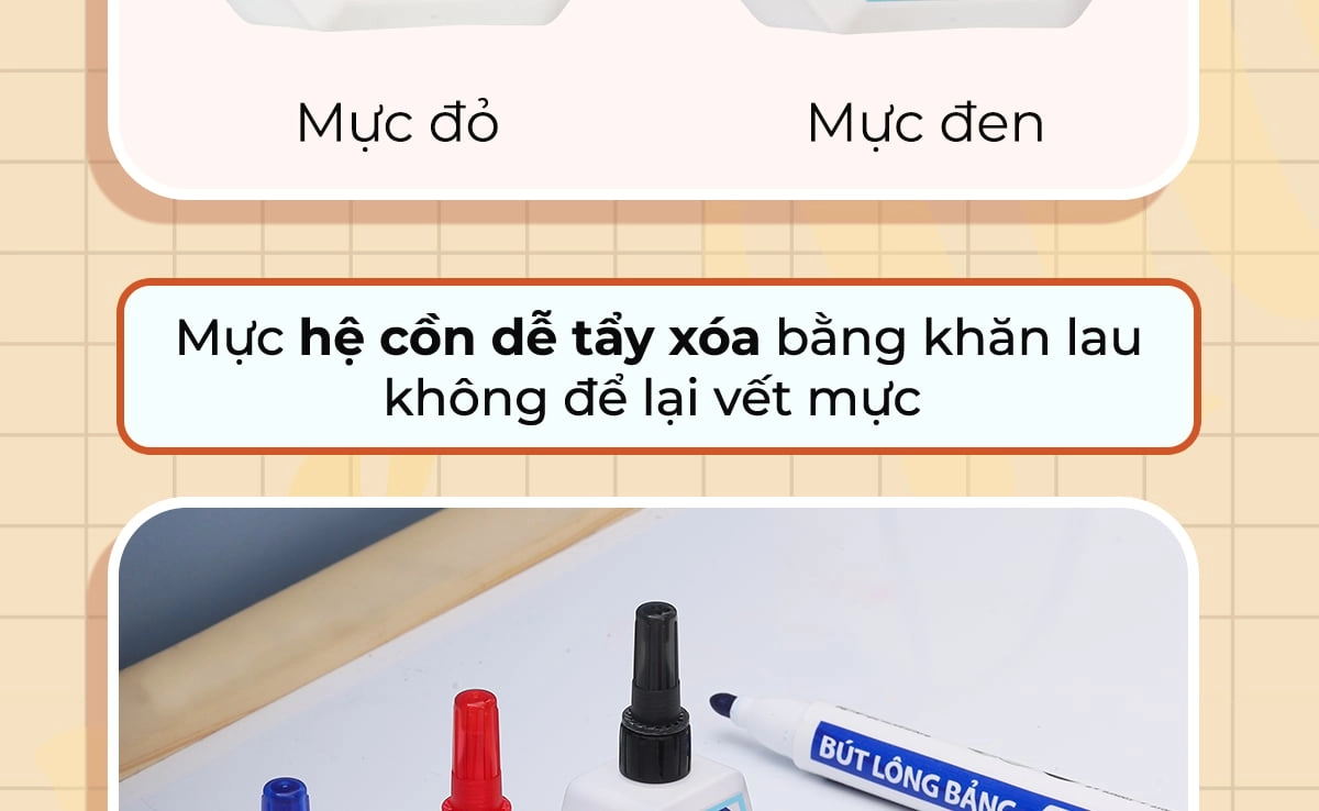 - Màu mực tươi, nhanh khô, dễ dàng xóa sạch trên bảng trắng hoặc bề mặt nhẵn.