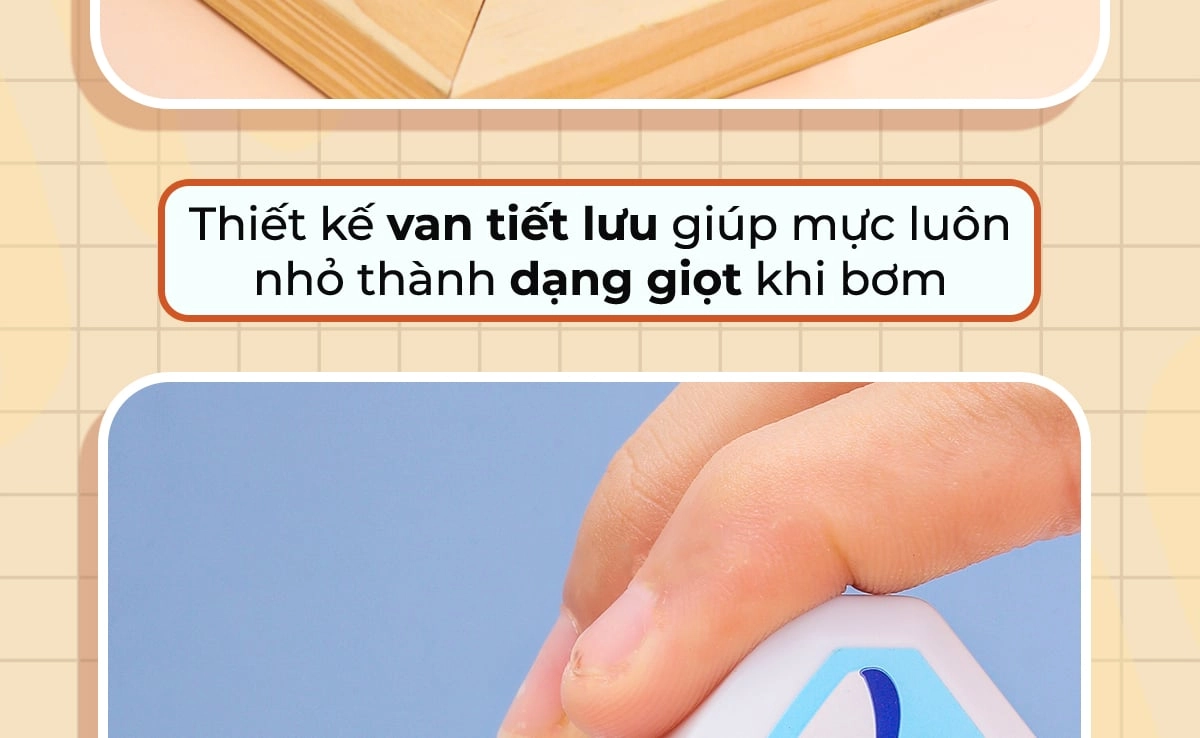 - Thiết kế hộp khoa học giúp tránh bay hơi và chảy mực. Van tiết lưu giúp mực luôn nhỏ thành dạng giọt khi bơm.