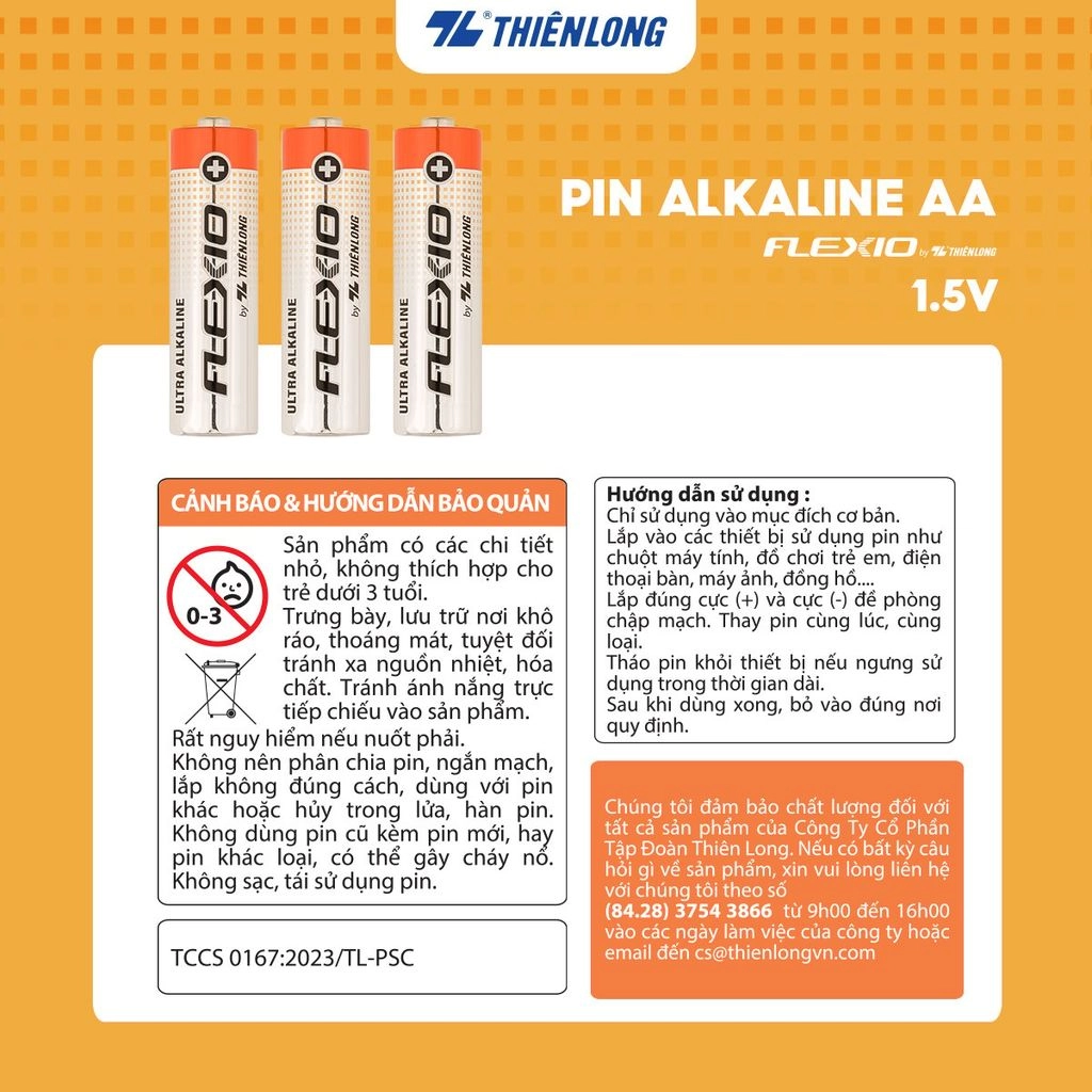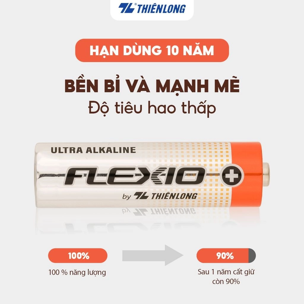 Pin Alkaline AA Thiên Long Flexio là loại pin kiềm bền bỉ, cho năng lượng mạnh mẽ và thời gian sử dụng lâu dài, phù hợp cho nhiều thiết bị điện tử gia dụng.