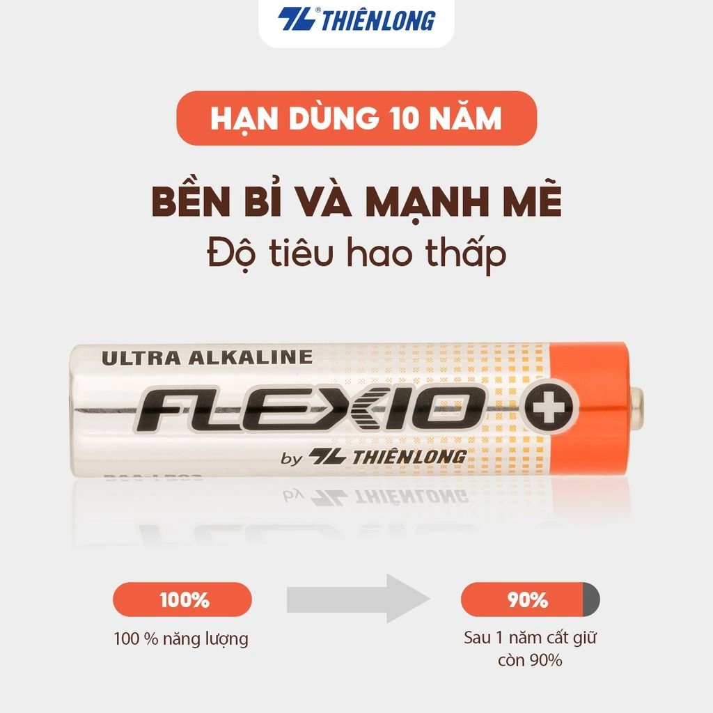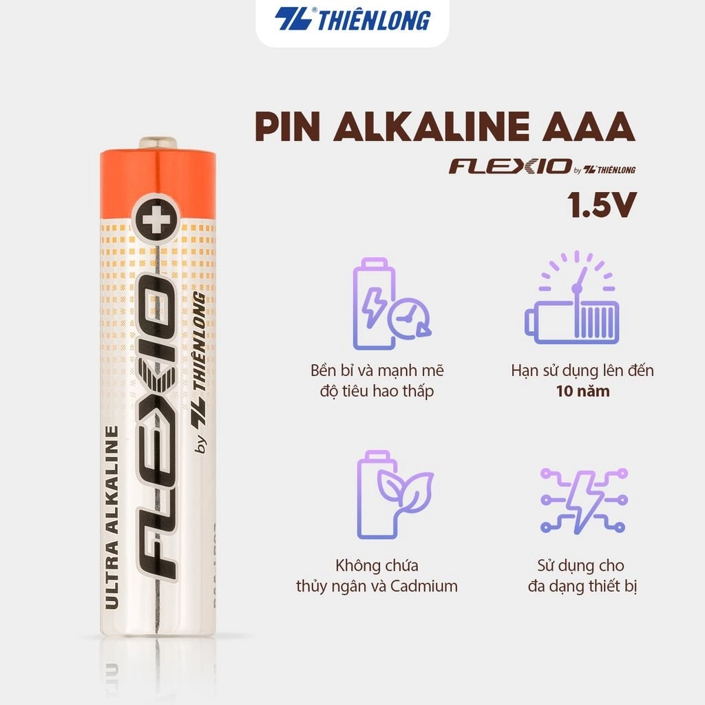 Pin Alkaline AAA Thiên Long Flexio là pin kiềm dung lượng cao, cung cấp nguồn năng lượng ổn định và bền bỉ cho các thiết bị điện tử nhỏ như điều khiển, chuột, hay đồng hồ.