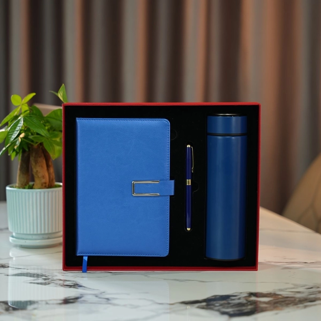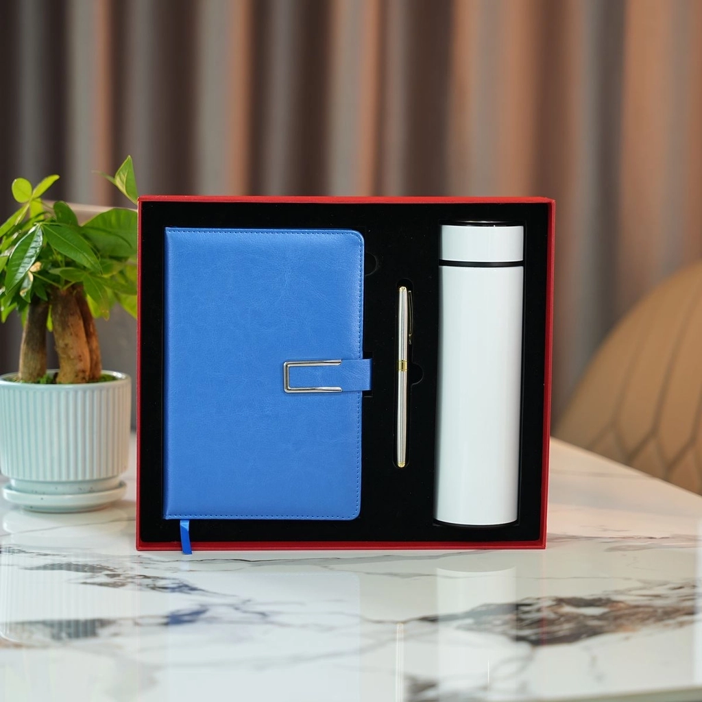 Sự phối hợp tinh tế giữa sổ tay da xanh navy, bút kim loại phối đen trắng, và bình giữ nhiệt màu xanh navy hoặc trắng bạc mang đến tổng thể hài hòa, nổi bật phong cách chuyên nghiệp và đẳng cấp. Gam màu trung tính dễ ứng dụng, phù hợp cho cả nam và nữ, đảm bảo ấn tượng tốt trong mọi dịp tặng quà.